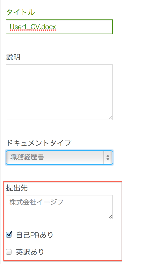 すでに作成済のファイルを「編集」すればタイプを変更し、そのタイプに必要なメタデータを設定できます。いったん「通常のドキュメント」として追加したファイルのタイプを今作成した「職務経歴書」へと変更してみると、こんな風に編集できます。